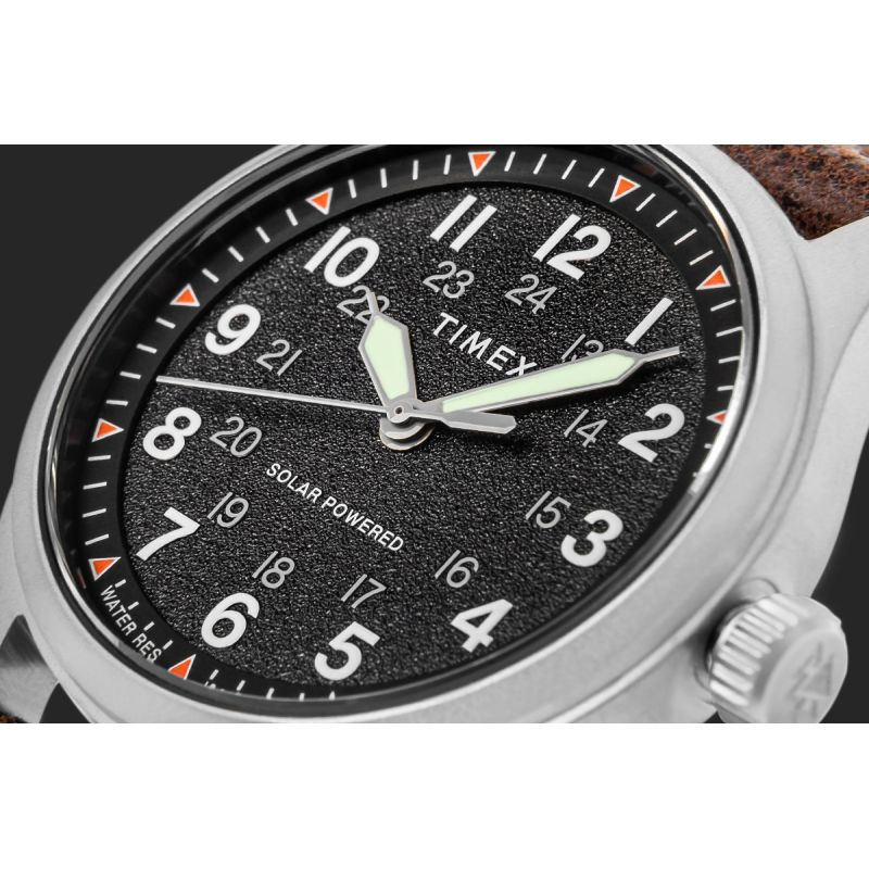 Tarcza utrzymana jest w głębokiej, ciemnej kolorystyce z wyraźnie ziarnistą, lekko chropowatą fakturą, która nadaje jej surowego, użytkowego stylu. Duże, arabskie cyfry zapewniają doskonałą czytelność, a wewnętrzny pierścień z oznaczeniami 24-godzinnymi pozwala na szybkie odczytanie czasu w formacie dobowym. Całość uzupełniają subtelne, pomarańczowe akcenty na skali minutowej, które dodają energii i podkreślają sportowy charakter modelu.