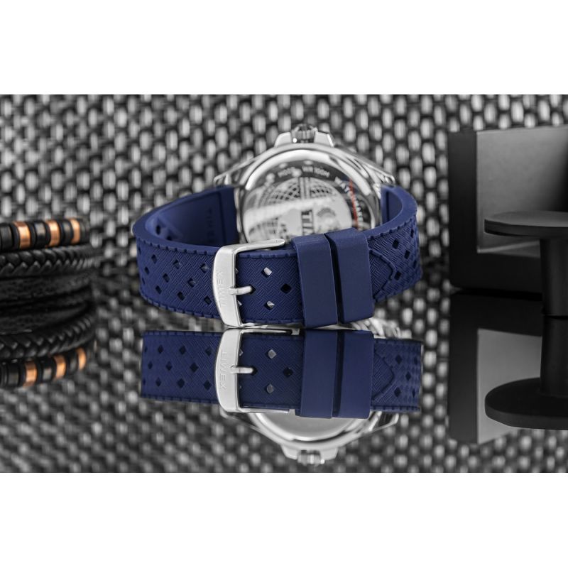 Męski Model TIMEX Harborside Coast prezentuje się znacznie powyżej swojej klasy cenowej, oferując wygląd i jakość godną luksusowych diverów. Masywnastalowa koperta o średnicy 44 mm, polerowane wykończenie i obrotowy bezel z czytelnymi oznaczeniami sprawiają, że zegarek natychmiast przywodzi na myśl sportowe modele premium. Centralnym punktem jest datownik z wypukłym szkłem powiększającym – detal, który dodaje zegarkowi klasy i nawiązuje do najlepszych wzorców w świecie czasomierzy.Granatowa tarcza typu sunray i perforowany kauczukowy pasek zapewniają nie tylko świetny wygląd, ale i wygodę – także w wodzie, dzięki wodoszczelności do 100 m. Luminacja wskazówek i indeksów oraz osłona koronki to detale, które czynią ten zegarek funkcjonalnym i gotowym na każdą przygodę. Całość stanowi idealny wybór dla mężczyzny, który chce wyróżniać się nowoczesnym, prestiżowym dodatkiem.