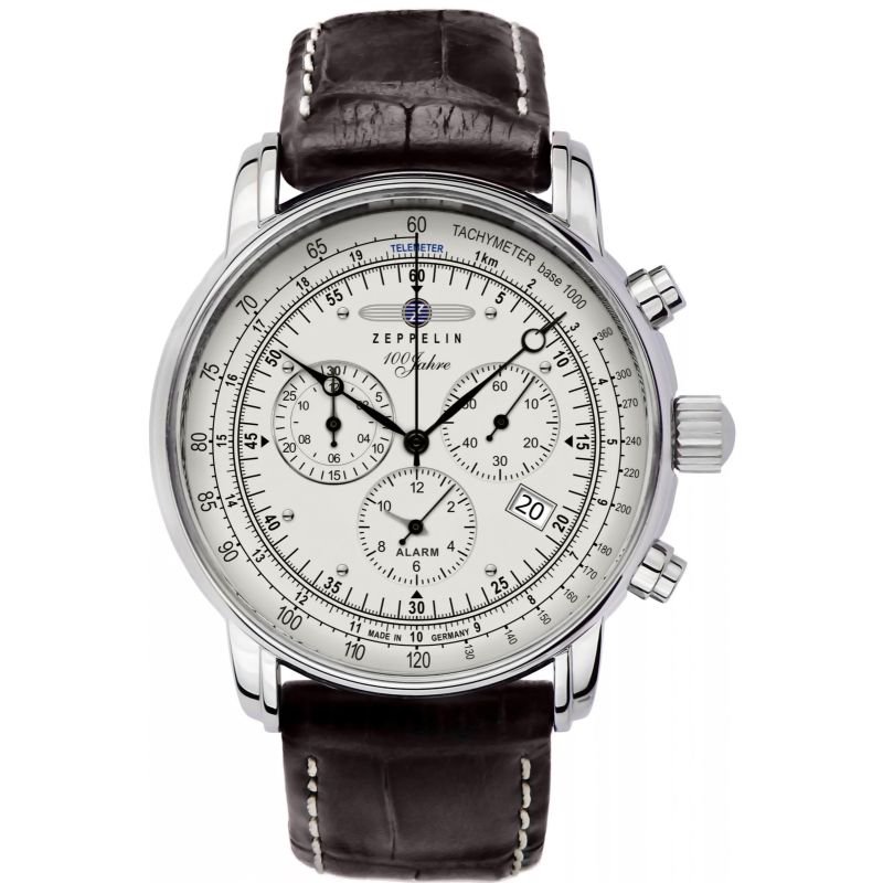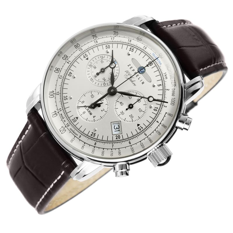 Zegarek lotniczy 100 Jahre Chronograph 7680-1 z limitowanej edycji powstałej, aby uczcić setną rocznicę istnienia legendarnej firmy Zeppelin. Ten wyjątkowy, jubileuszowy model dla mężczyzn wyróżnia się eleganckim designem, podkreślonym subtelnymi czarnymi akcentami, które dodają mu wyrafinowanego charakteru. Zegarek wyposażony jest w funkcje takie jak chronograf do precyzyjnego pomiaru czasu, alarm, datownik, telemetr do mierzenia odległości na podstawie różnicy czasu między zjawiskami oraz tachometr.