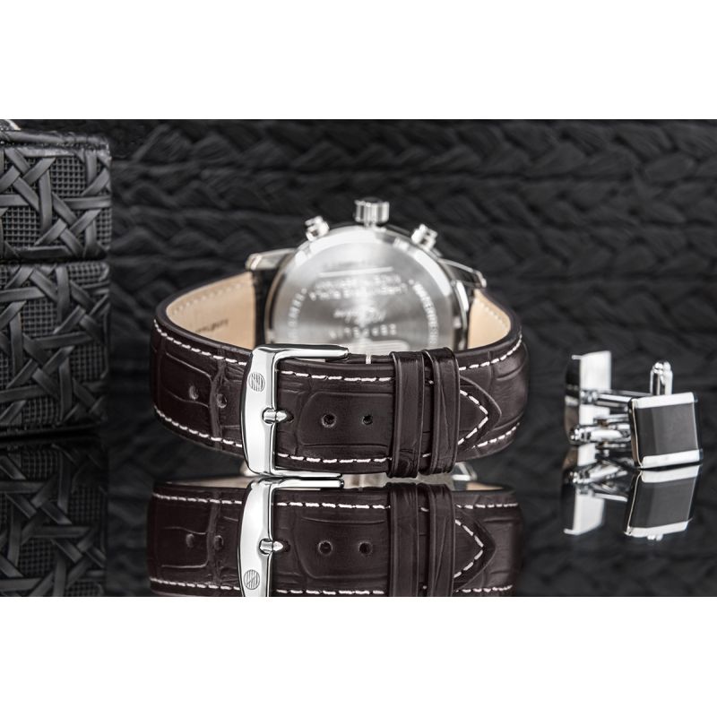 Model z wyjątkowej serii powstałej z okazji 100-lecia marki podkreślono upamiętniającym grawerunkiem znajdującym się na deklu czasomierza. Srebrna koperta, subtelnie lśniąca, idealnie komponuje się z tarczą w odcieniu metalicznego szampana, która emanuje ciepłem i wyrafinowaniem. Czarne indeksy i cyfry, w połączeniu z czarnymi wskazówkami oraz sekundnikiem, zapewniają doskonałą czytelność i klasyczny wygląd. Pasek w głębokim czekoladowym odcieniu, przeszyty delikatną brązową nitką, podkreśla rzemieślniczy kunszt i dodaje całości nuty tradycyjnego charakteru. Srebrna sprzączka i koronka dopełniają kompozycję, tworząc spójny, elegancki zegarek, który łączy w sobie funkcjonalność i niepowtarzalny styl.