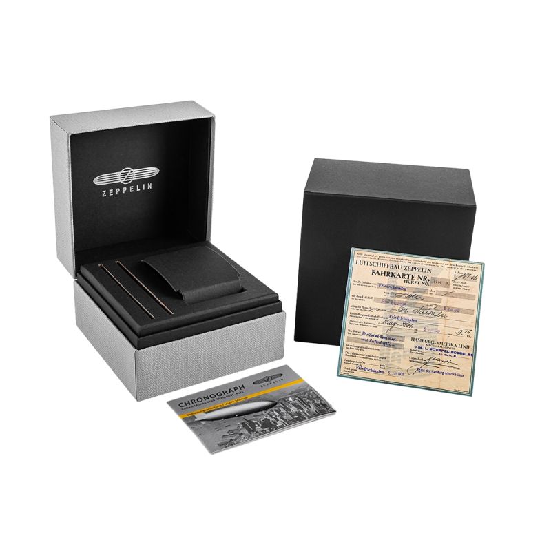 Każdy zegarek marki Zeppelin jest dostarczany w wyjątkowym, eleganckim pudełku sygnowanym logo marki, które nawiązuje do dziedzictwa historycznych sterowców. To nie tylko praktyczne opakowanie, ale także prawdziwa esencja stylu i klasy, które sprawiają, że czasomierz staje się jeszcze bardziej wyjątkowy. Do zestawu dołączany jest również stylowy certyfikat inspirowany dawnymi biletami lotniczymi Zeppelin, co dodatkowo podkreśla charakter tej niezwykłej marki i jej unikalne korzenie. Takie opakowanie czyni każdy zegarek idealnym prezentem, gotowym do wręczenia – każdy detal, od solidnej konstrukcji pudełka po jego starannie zaprojektowaną estetykę, buduje poczucie luksusu i prestiżu.