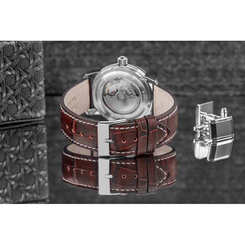 Dzięki precyzyjnemu mechanizmowi automatycznemu z 21 kamieniami łożyskowymi nie musisz się martwić o baterię – zegarek napędza się ruchem Twojego nadgarstka, a jego solidne wykonanie gwarantuje trwałość i niezawodność przez lata. To rozwiązanie eliminuje konieczność myślenia o baterii – zegarek napędza się ruchem Twojego nadgarstka, co sprawia, że jest zawsze gotowy do działania. Precyzyjne wykonanie i testy zapewniają niezawodność w każdej sytuacji. Posiadanie automatycznego zegarka to jak noszenie na ręku dzieła sztuki. - dla mężczyzn, którzy cenią precyzję, niezawodność i klasyczne rozwiązania technologiczne.