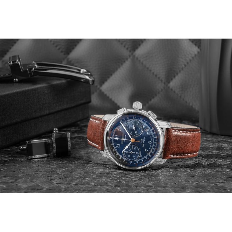 Zegarek męski Zeppelin LZ 126 Los Angeles 7614-3 to wyjątkowy model łączący elegancję z funkcjonalnością. Inspiracją dla jego projektu była era majestatycznych sterowców, co nadaje mu niepowtarzalny charakter. Wyposażony został w precyzyjny mechanizm kwarcowy Miyota 6S21, który zapewnia niezawodność i dokładne odmierzanie czasu. Koperta ze stali szlachetnej o średnicy 42 mm i grubości 12 mm prezentuje się solidnie, a jednocześnie komfortowo układa się na nadgarstku. Granatowa tarcza z białymi wskazówkami pokrytymi warstwą Super-Luminova gwarantuje doskonałą czytelność w każdych warunkach. Zegarek posiada chronograf, datownik oraz tachymetr, co czyni go praktycznym towarzyszem na co dzień. Tarczę chroni wypukłe szkło mineralne K1, odporne na zarysowania. Całość uzupełnia klasyczny, brązowy pasek ze skóry naturalnej, nadający całości eleganckiego charakteru. Model jest wodoszczelny do 5 ATM i sprzedawany w oryginalnym pudełku BOX, dzięki czemu doskonale nadaje się również na prezent.