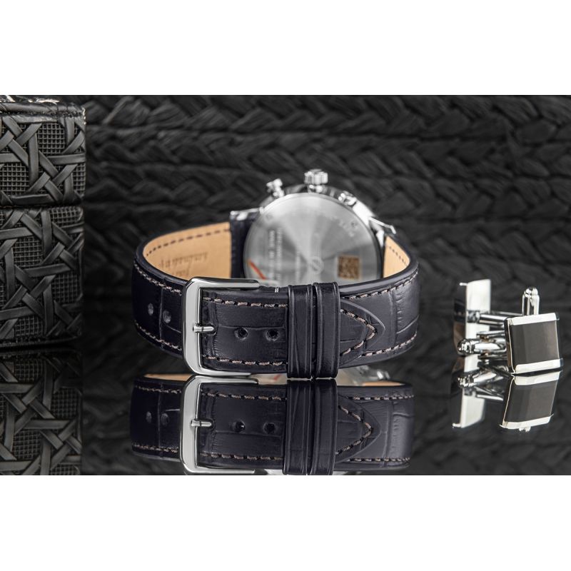 Srebrna koperta, solidna i lśniąca, doskonale kontrastuje z głębokim, metalicznym granatem tarczy, który przywołuje na myśl nocne niebo w czasie lotu sterowcem. Wyraziste białe cyfry i indeksy, idealnie komponujące się z białymi wskazówkami i sekundnikiem, zapewniają doskonałą czytelność i podkreślają lotniczy charakter zegarka.Czarny pasek, subtelnie przełamany brązową nitką, dodaje całości wyrafinowania i nawiązuje do rzemieślniczego kunsztu, łącząc elegancję z trwałością. Srebrna sprzączka i koronka dopełniają kompozycji, nadając zegarkowi harmonii i spójności w stylistyce.Idealny wybór dla tych, którzy pragną nosić na nadgarstku klasyczny czasomierz w najlepszym możliwym wydaniu.