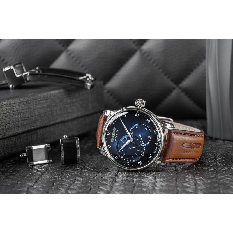 Jego elegancka, srebrna koperta idealnie komponuje się z głęboką granatową tarczą o metalicznym wykończeniu, przyciągając spojrzenia subtelnymi refleksami światła. Srebrne indeksy i wskazówki z białymi akcentami dodają mu ponadczasowej klasy i zapewniają wyjątkową czytelność. Pasek wykonany z wysokiej jakości skóry w jasnobrązowym odcieniu, zszyty brązową nicią, co dodaje mu subtelnego charakteru vintage. Na pasku znajduje się tłoczone logo Zeppelin oraz napis, które podkreślają luksusowy i autentyczny charakter zegarka. Każdy element, od solidnej srebrnej sprzączki po stylową koronkę, został dopracowany, by stworzyć spójną i wyjątkową kompozycję.