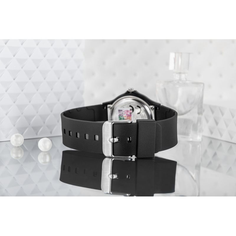 harmonijne połączenie kontrastowej bieli i głębokiej czerni, które nadaje mu elegancki, a jednocześnie ponadczasowy charakter. Czysta, biała tarcza z wyraźnymi czarnymi cyframi zapewnia czytelność i delikatnie przyciąga wzrok, tworząc elegancki akcent. Matowy, czarny pasek gładko łączy się z kopertą, tworząc jednolitą, harmonijną całość – to zegarek, który dyskretnie podkreśli kobiecą elegancję, dodając jej odrobinę tajemniczości i wyrafinowania. Dzięki lekkiej konstrukcji i wygodnemu paskowi, zegarek nosi się komfortowo, niemal jak druga skóra, a wodoodporność zapewnia ochronę nawet w tych bardziej zabieganych, nieprzewidzianych chwilach. To nie tylko zegarek – to subtelny akcent, który podkreśla Twoją klasę i dodaje wyrazu każdemu spojrzeniu na nadgarstek.