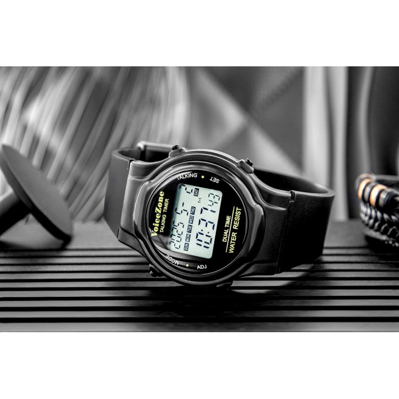 Zegarek informuje głosowo o aktualnym czasie w dwóch strefach czasowych – świetna opcja np. przy kontakcie z rodziną za granicą. Ma również mówiący budzik z funkcją drzemki (dobudzania) oraz głosowy timer – przydatny w kuchni, podczas ćwiczeń lub na spacerze.