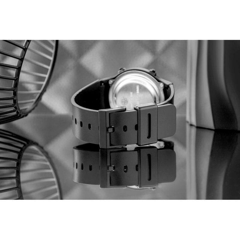 Duży, kontrastowy wyświetlacz LCD zapewnia szybki i czytelny odczyt godziny, daty oraz dni tygodnia – wszystko podane w przejrzysty sposób, bez zbędnych ozdobników. Pod ekranem znajduje się czytelne oznaczenie funkcji DUAL TIME oraz WATER RESIST, a po bokach rozmieszczone są cztery intuicyjne przyciski funkcyjne, wyraźnie oznaczone (MODE, TALKING, SET, ADJ), dzięki czemu obsługa zegarka jest wygodna nawet dla osób starszych.