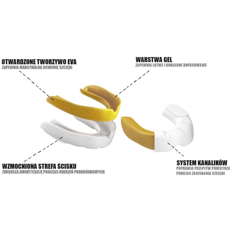 Gold/Whiteto ochraniacz, który nie zna słowa „odpuszczam”. Podwójna tarcza – silikon i żel – daje Ci to, czego potrzebujesz: pancerną ochronę i idealne dopasowanie. Wyprofilowane wypustki z zewnątrz blokują ochraniacz na miejscu, a kanały powietrzne pozwalają zaciskać zęby bez utraty tchu.