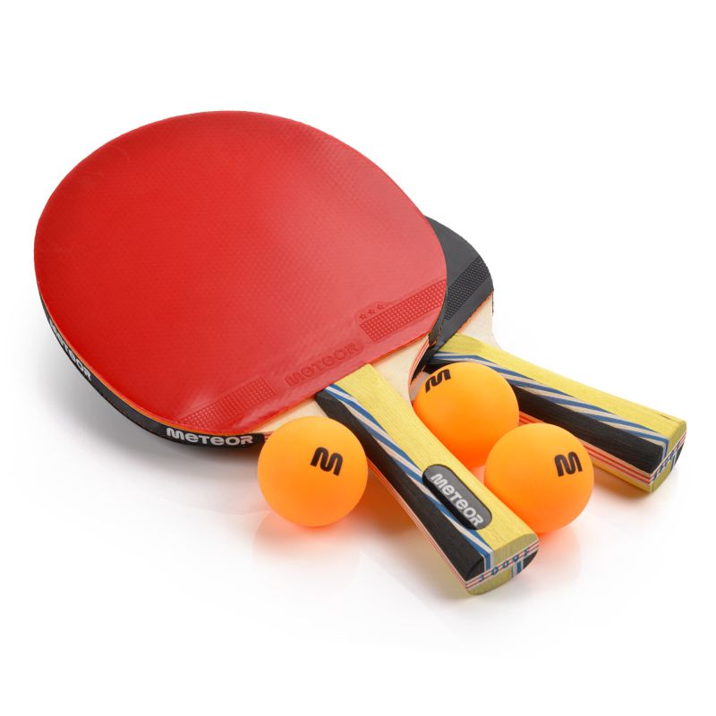 Zestaw do tenisa stołowego zawierający 2 rakietki i 3 piłeczki.