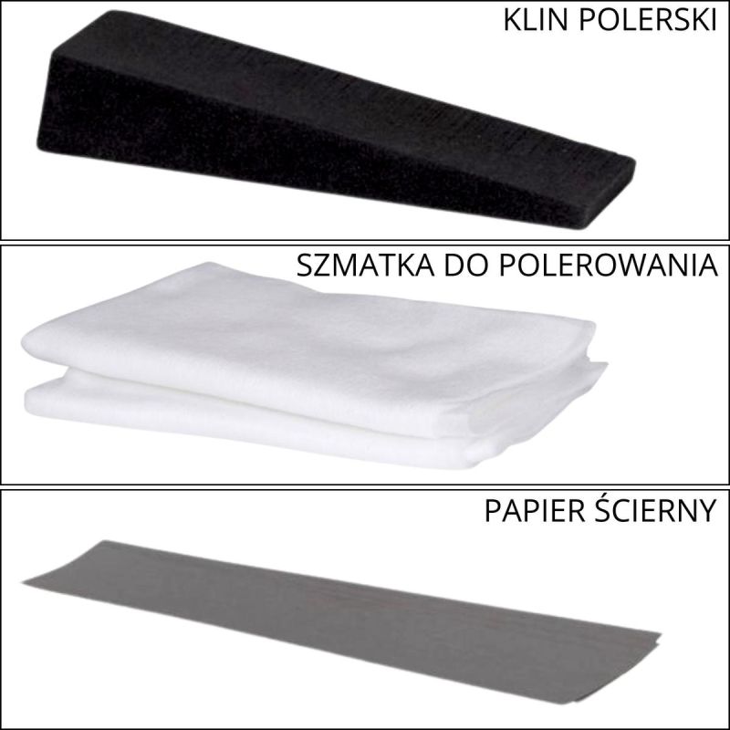 - Zestaw zawiera: 1x Pasta REPAIR – 25 g, 1x Pasta FINISH – 25 g, 4x paski papieru ściernego , 1x klin polerski, 2x ściereczki polerskie.