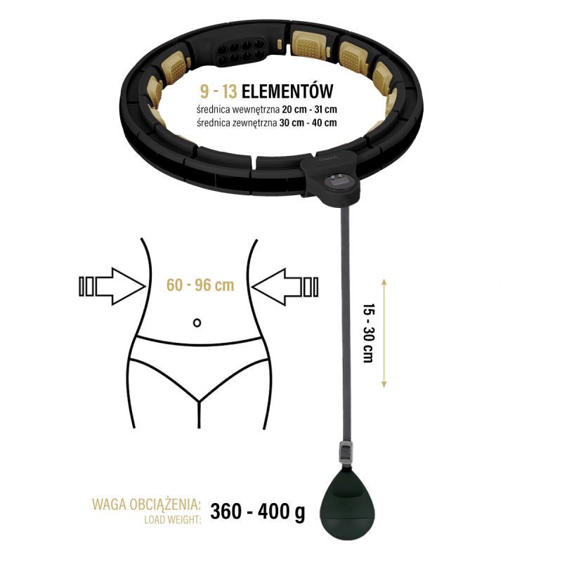 9. Zestaw Hula Hop Magnetyczny Black/Gold HHM13 z Licznikiem HMS + Pas Wyszczupłający BR163 Black