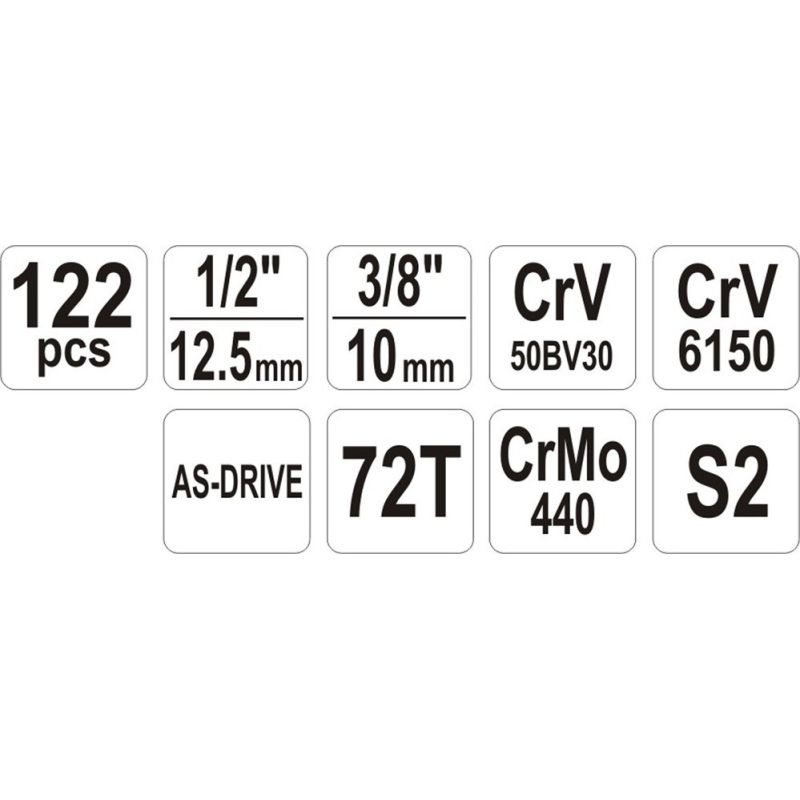 - przeguby Cardana: 1/2” (12.7 mm), 1/4” (6.3 mm), nasadki do świec 1/2” (12.7 mm): 16, 21 mm, grzechotki: 1/2” (12.7 mm): 255 mm; 72T, 1/4” (6.3 mm): 155 mm; 72T