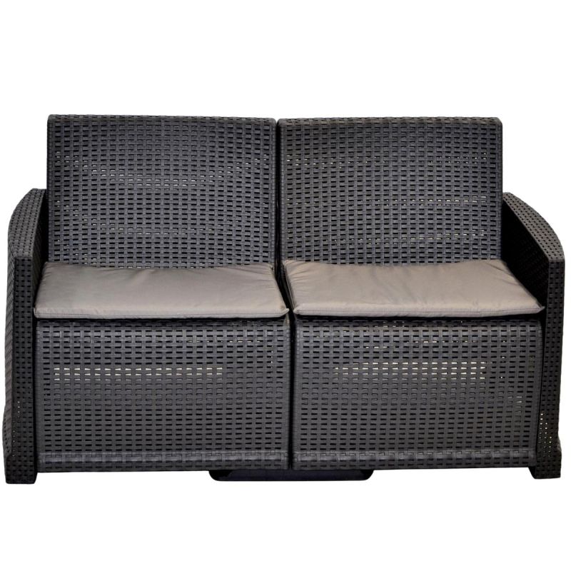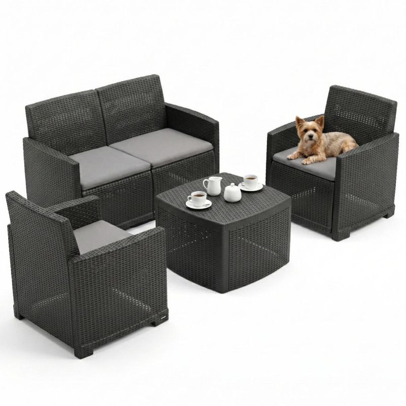 ZESTAW MEBLI WYPOCZYNKOWYCH 2 FOTELE SOFA STOLIK COMO to funkcjonalne rozwiązanie do ogrodu, na taras, balkon czy działkę. Stylowa plecionka w kolorze antracytowym nadaje elegancji, a wygodne poduszki sprawiają, że każda chwila relaksu staje się jeszcze przyjemniejsza. To gotowy komplet, który pozwala stworzyć komfortową przestrzeń do spotkań z rodziną i przyjaciółmi.