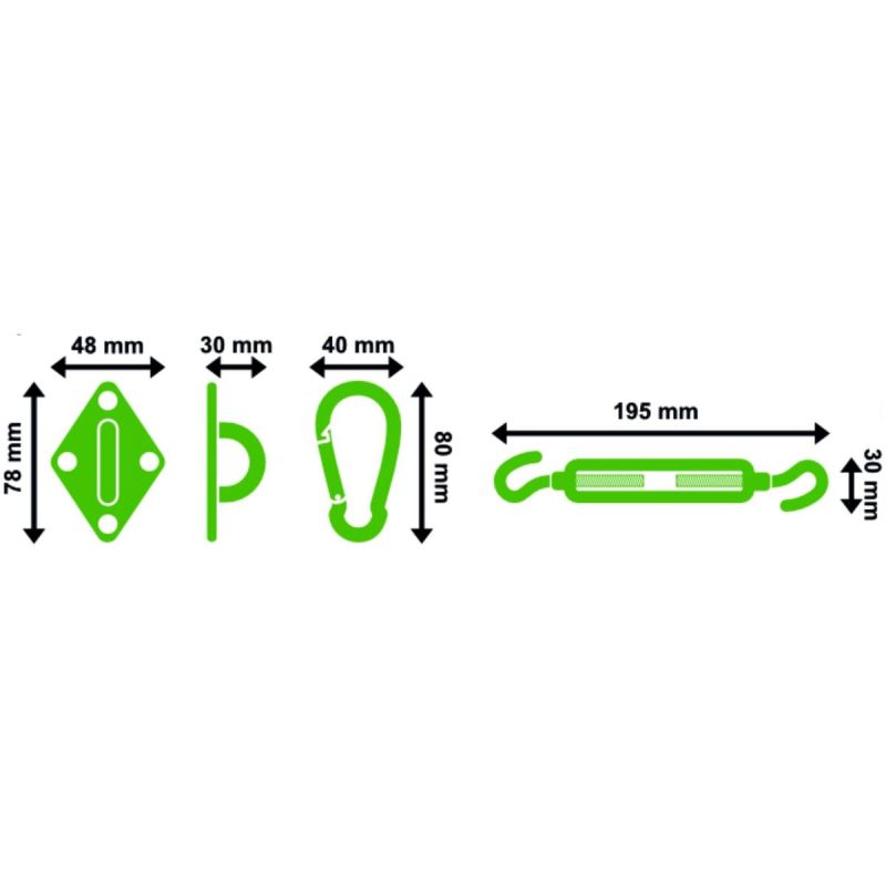 Zestaw pasuje do różnych rodzajów żagli przeciwsłonecznych i może być montowany na ścianach, słupach czy innych powierzchniach.