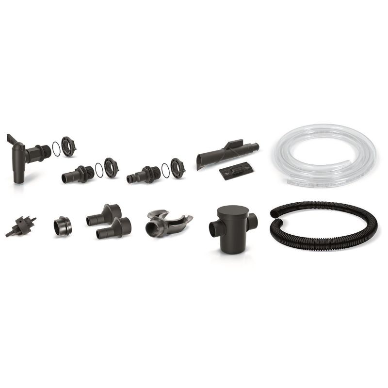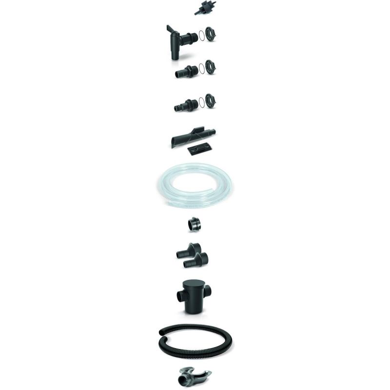 - Zestaw składa się z: otwornica, kranik, uniwersalne przyłącza x 2, wąż ogrodowy, wylewka, wieszak, reduktor, wąż, filtr zewnętrzny, łapacz