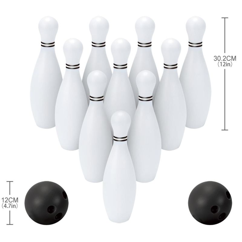 Komplet zawiera 10 kręgli + 2 kule i umożliwia grę w pojedynkę lub w parach. Kule są lekkie i mają gładką powierzchnię, a kręgle stabilnie stoją nawet na podłodze lub trawie..