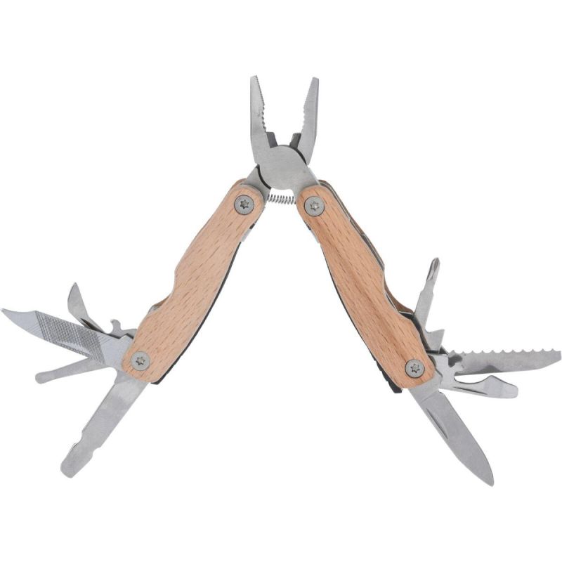 Zestaw zawiera m.in. kombinerki z długim noskiem i standardowe, przecinacz do drutu, nożyk z ząbkami, nożyk, płaski śrubokręt i śrubokręt krzyżowy ,mały śrubokręt, duży śrubokręt, pilniczek, przyrząd do czyszczenia paznokci, otwieracz do butelek, otwieracz do puszek.