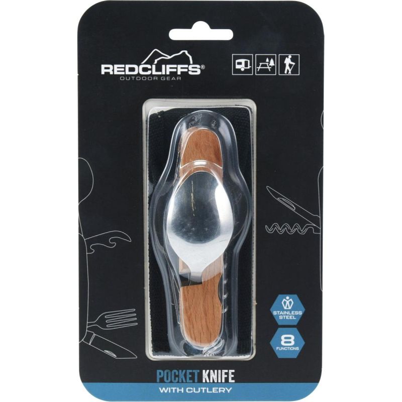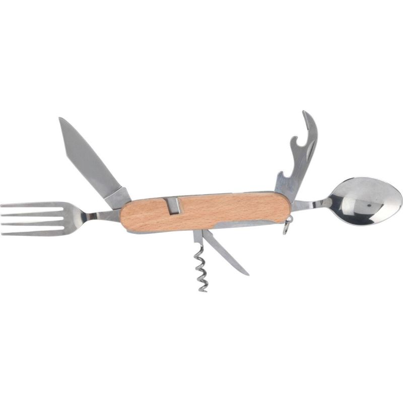 - 6w1: nóż, nożyk z ostrym końcem, łyżka, widelec, korkociąg, otwieracz do puszek, etui, kółko na klucze