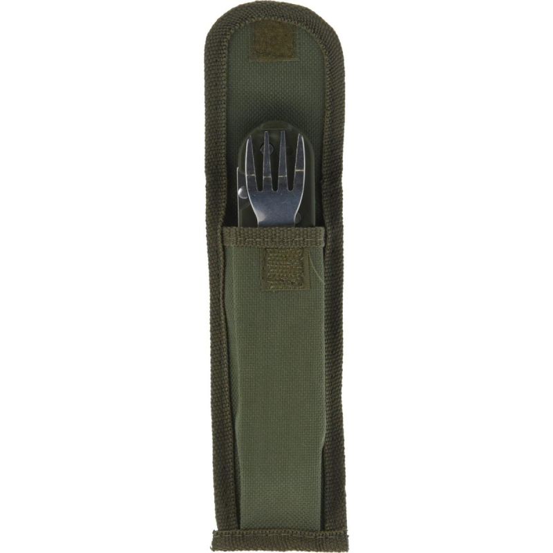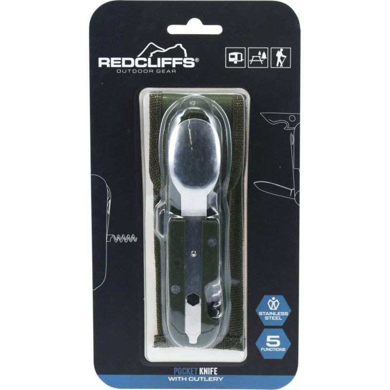 - 5w1: nożyk z ostrym końcem, łyżka, widelec, korkociąg, otwieracz do puszek, etui, kółko na klucze